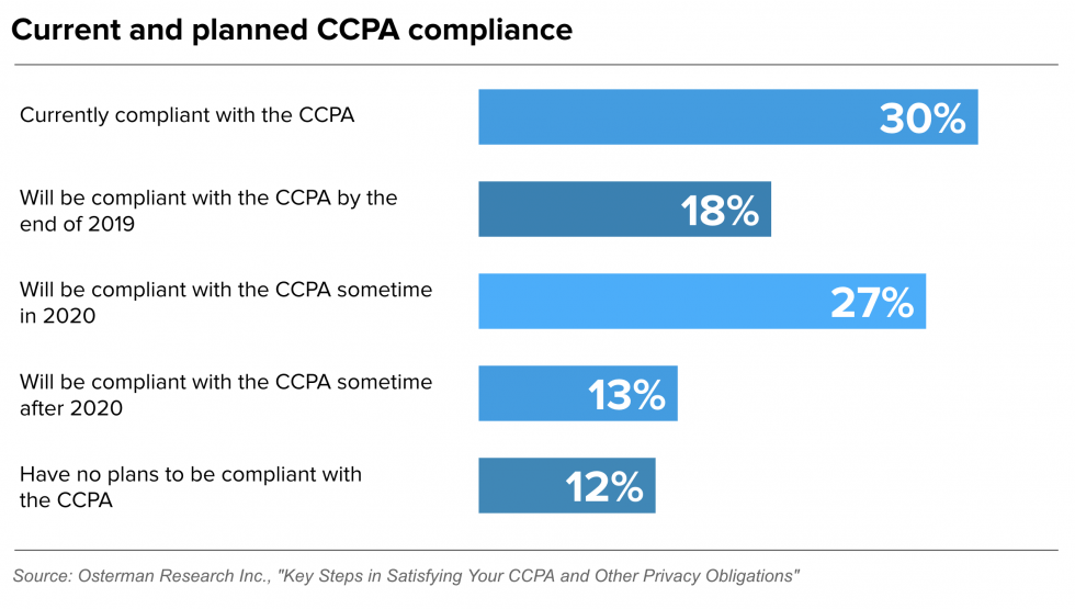 Research shows that most companies are not prepared to handle the challenges of CCPA. In October 2019, Osterman Research surveyed companies on behalf of data security software company Egress to determine how prepared they were for CCPA. The results were a bit sobering; more than half of them didn’t expect to be compliant with the law before it took effect.